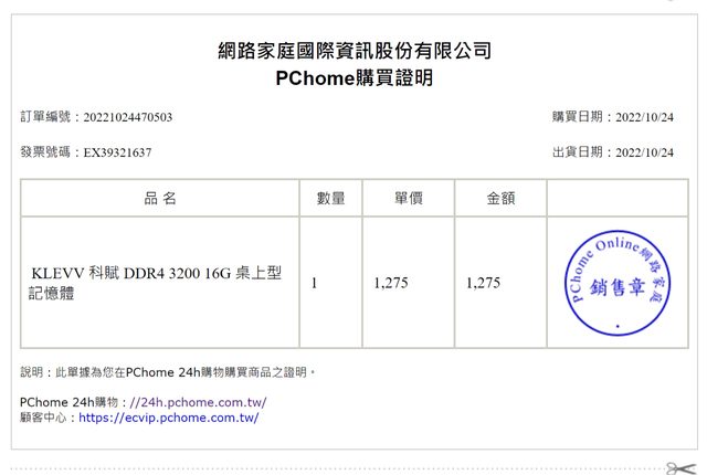 記憶體一隻PcHome 2022/10/24購入