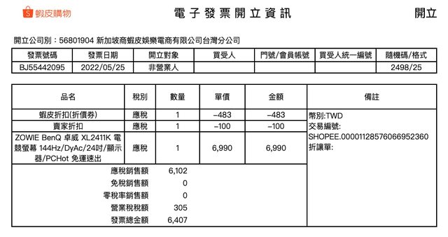 蝦皮開的電子發票