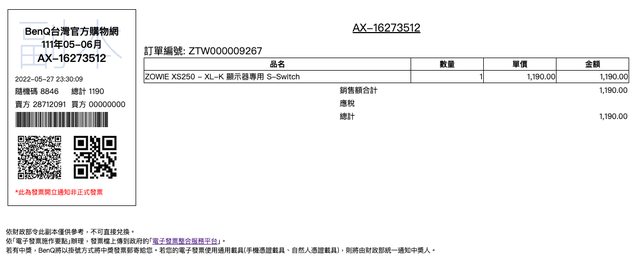 於 BenQ 官網購入的電子發票