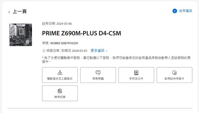 主板已登錄延長保固至2028/03/03,記憶體金士頓原廠終身保固