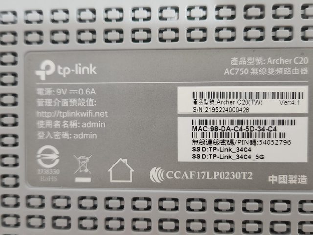 ◎硬體型號: tp-link Archer C20 AC750 無線分享器