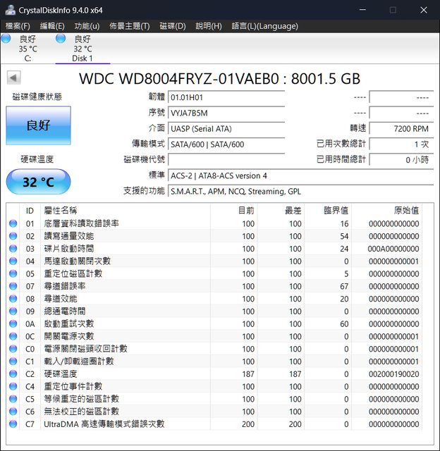 1、WD8004FRYZ,保固至2028/8