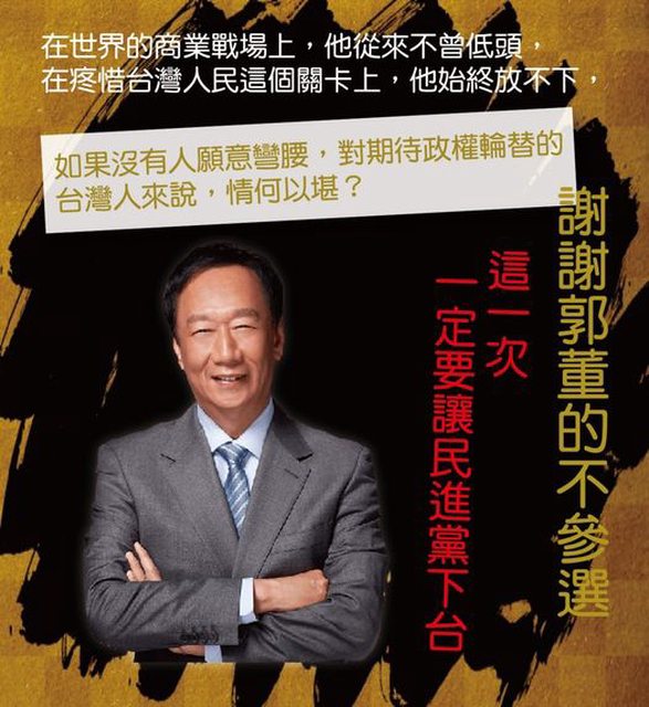 自從郭董宣布參選以來,歷盡很多輿論壓力與無情攻訐,始終沒有該辯郭先生的目標,他