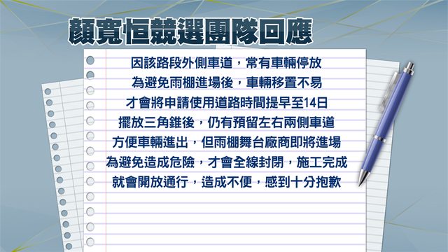 封路爆民怨!顏寬恒競總:避免雨棚進場車輛移置不易