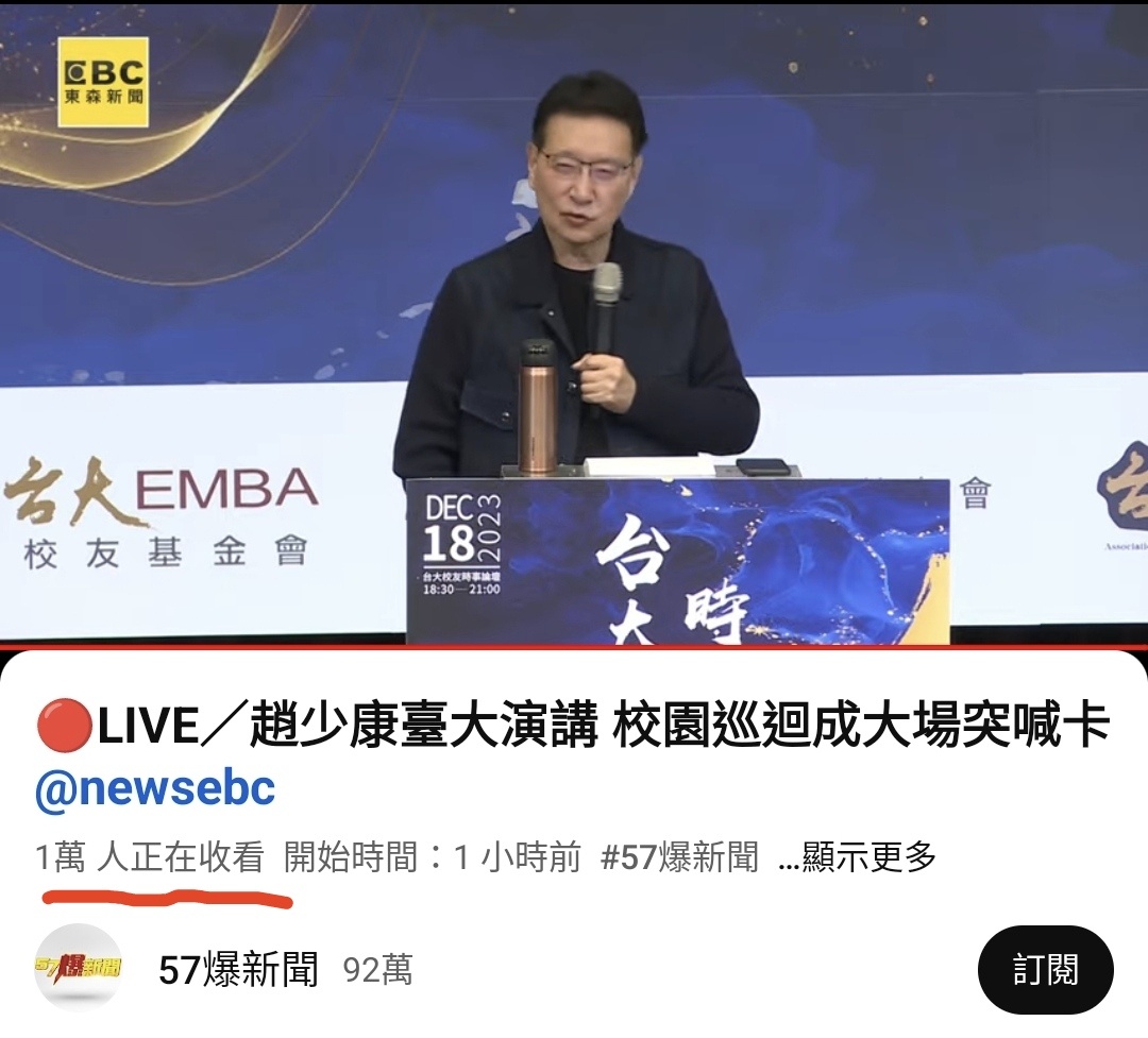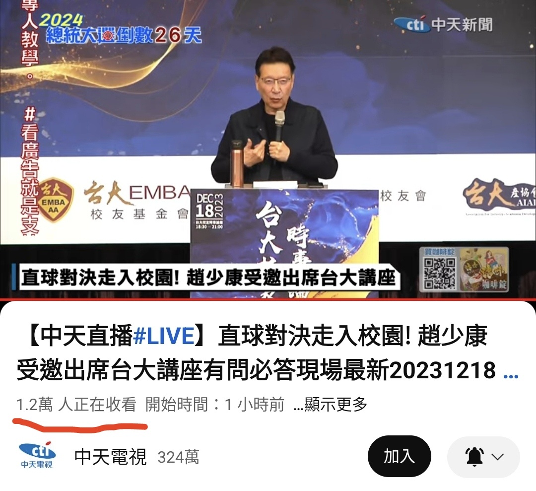 推 doig: 趙少康剛剛台大演講有到4萬,好幾台分流(7 36.225.121.56 12/18 21:14