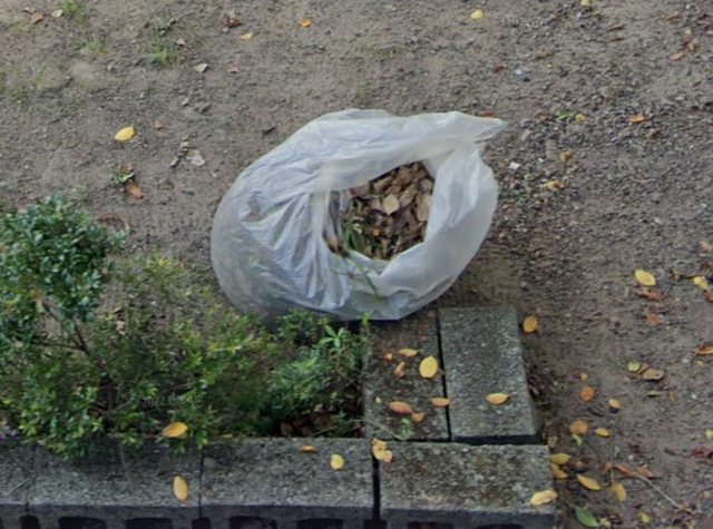 放大一看 不得了! 是半透明塑膠袋裝落葉垃圾