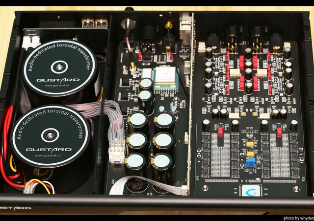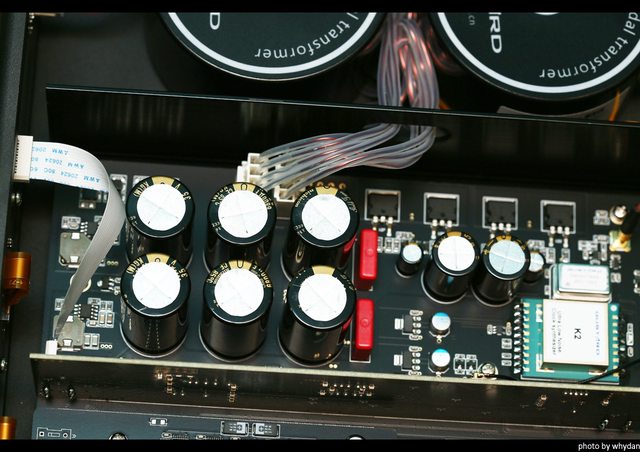 內部,分四大塊,左是環變,中是電源跟時脈處理,立起來是網橋,右是DAC