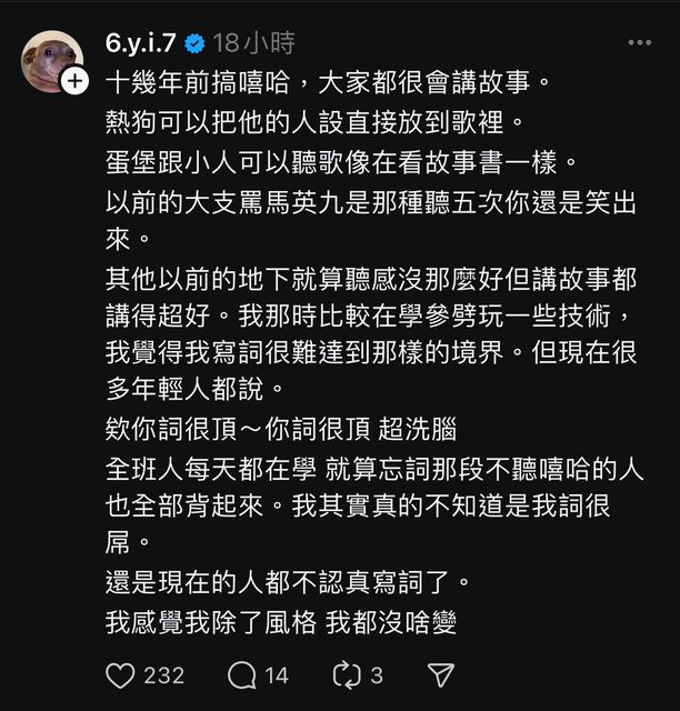 噓 stone82513: 真不習慣饒舌歌手整天都在社群媒體放話的時代 06/10 13:05