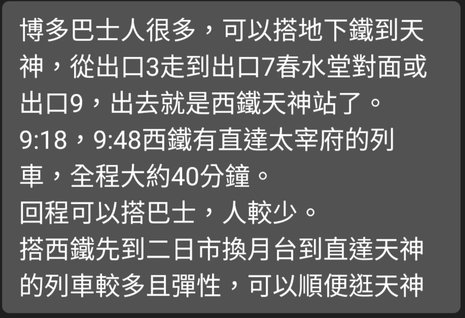 → wewe : 我記得天神有直達太宰府的,班次較少 06/27 22:59