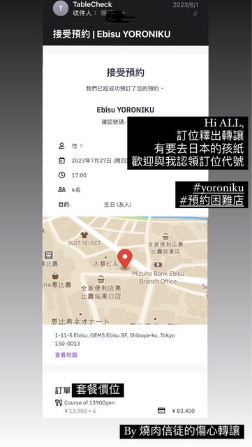 標題[讓售] YORONIKU Ebisu 燒肉訂位