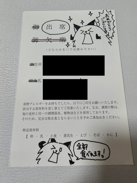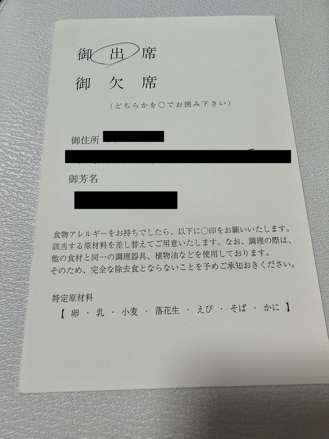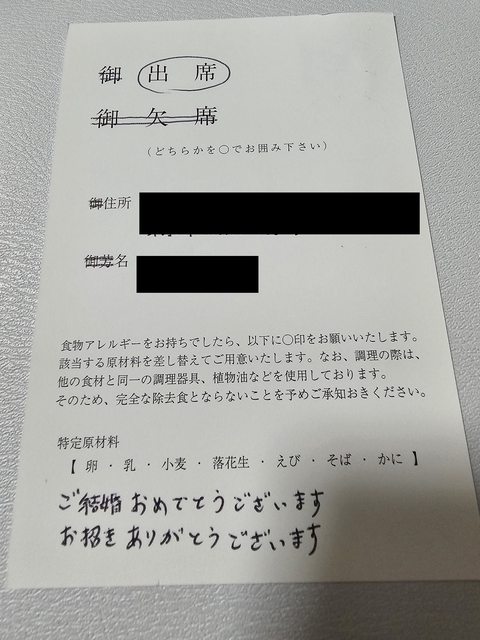 正面回函地址收件人,背面出席回覆、食物過敏圈選、回函者資訊。