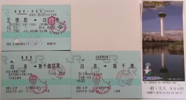 3/19五陵郭-白老 7790円 白老100 白老-新千歲1310円+630円千歲機場-支笏湖1050円