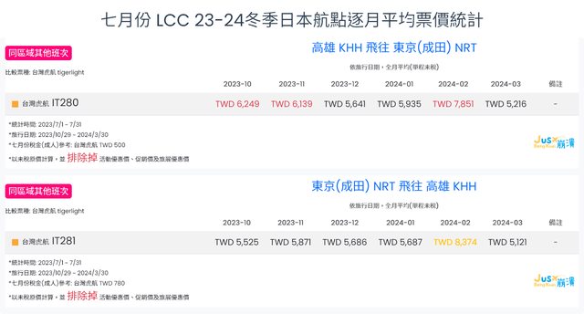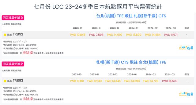 3. 酷航23冬台北=東京由於是從七月下旬才開始有大幅度價格調降,