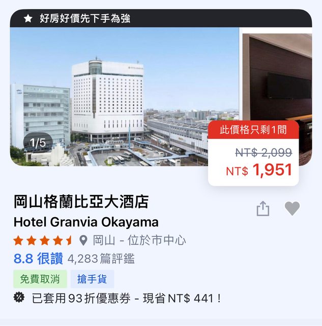 推 Kamelie : 我有訂明年東橫岡山站西口右... 08/15 02:20