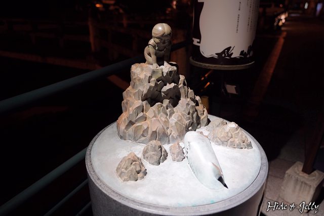 出湯跡的石燈籠與前方攔砂壩的小瀑布,也都有打上燈光,呈現與白天不同的樣貌。