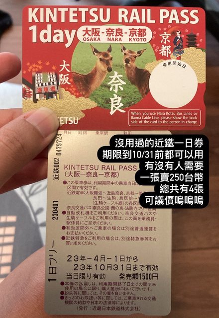 標題[讓售] 京都-大阪-奈良近鐵一日券4張