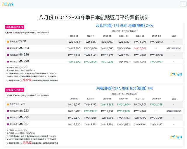 1. 樂桃台北沖繩 MM923、MM924 於出發月在 2024.03 的資料因