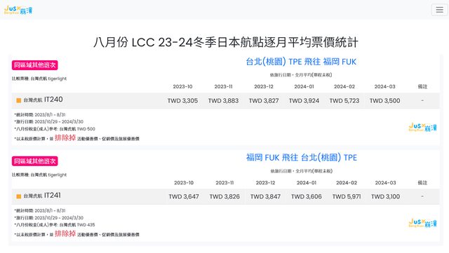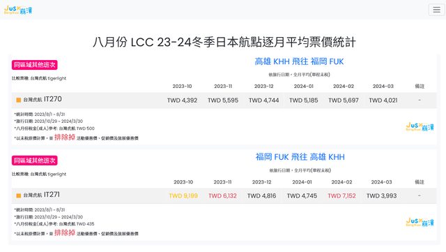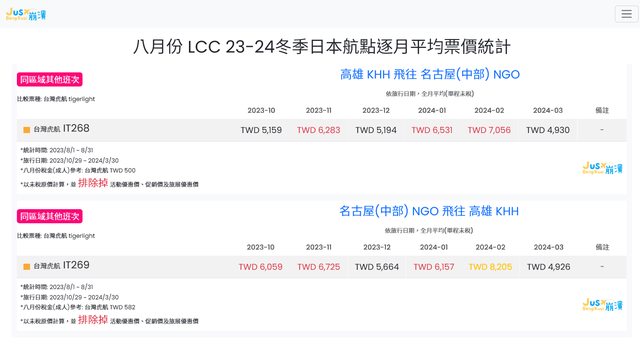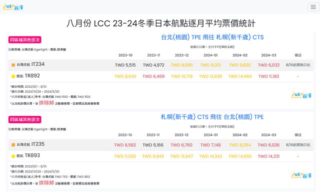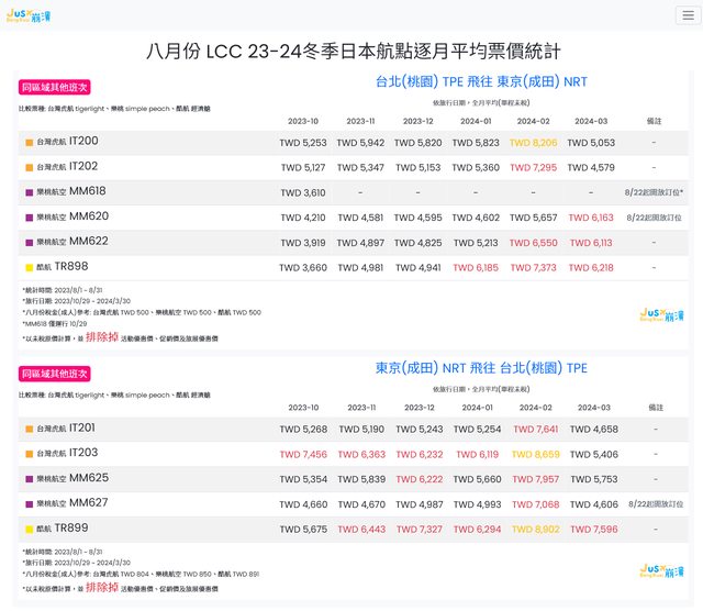 標題[分享] 8月份 LCC 23冬逐月平均票價統計