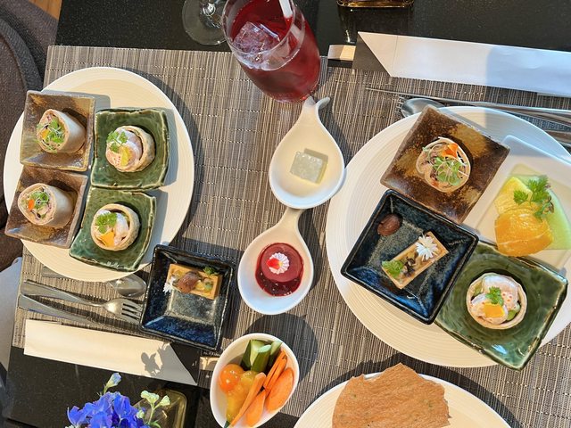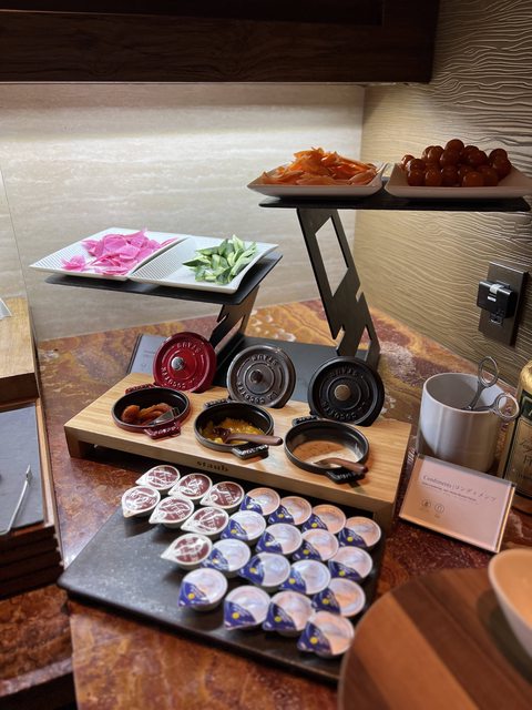 因為我有酒廊通行證,抵達飯店時便被帶到俱樂部酒廊辦理登記入住。酒廊平日提供現打果汁、咖啡、茶和簡單的乾果麵包小點心,飲料選單可掃描桌上的QR Code瀏覽,下午茶時段則提供很豐盛的三明治點心盤,還不錯吃。快樂時光則有調酒、無酒精調飲等,以及多款自取和單次提供的小食,並無熱食,水果盤是我最喜歡的一道。