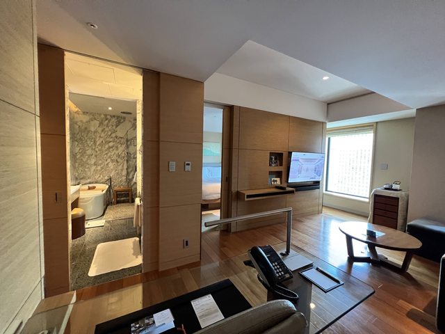 首次入住大阪洲際飯店,用免房券加上點數兌換基本房一晚,很幸運在辦理入住時被升到小套房,有隔開的客廳和臥室,然而景觀被附近大樓給遮住。門口進來右側有個衣物間可擺放行李,左側是浴室,有廁所、浴缸和淋浴間。客廳有辦公桌和大沙發,客房也有一組小沙發可躺坐,空間很寬廣舒適。