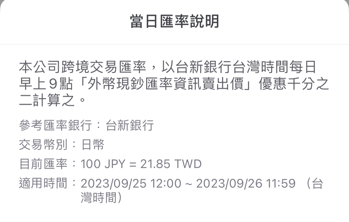 推 tony604064 : 匯率是台新提供,可以參考下圖 09/25 16:46