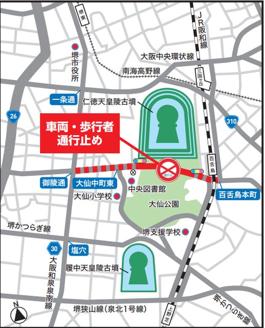 大仙陵古墳(仁徳天皇陵古墳)前的府道197号封閉