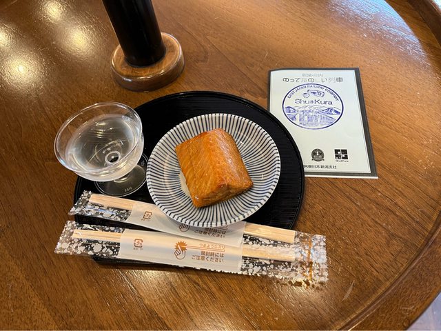 車上有提供選用當地食材製作的產品及新潟縣5款清酒。我們點了一杯鶴齡(400円)及鮭