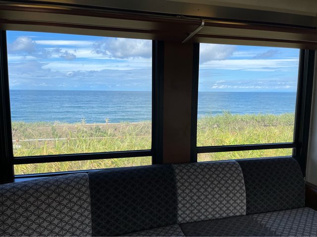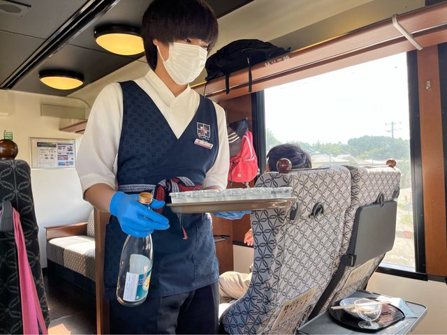 再發車後,有服務人員會提供當地清酒讓旅客免費品嚐;很巧的是,這位服務人員,我們