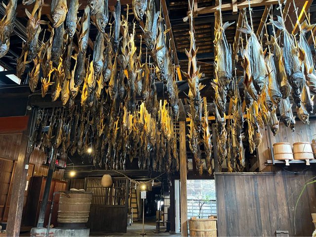 息、掛著幾條風乾的鮭魚。往後面走,出現讓人震撼的景象,滿室都是垂吊風乾中的鮭魚