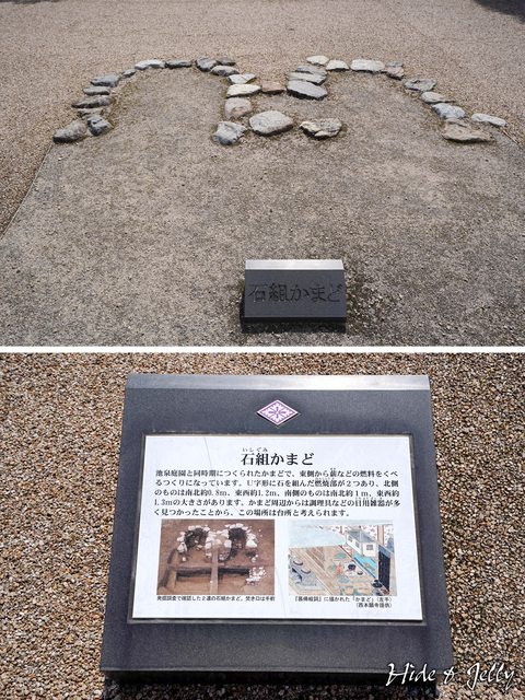 池泉庭園的北側,有石頭組成的灶,是煮飯、料理的區域,剛剛東側的建物基壇,有可能