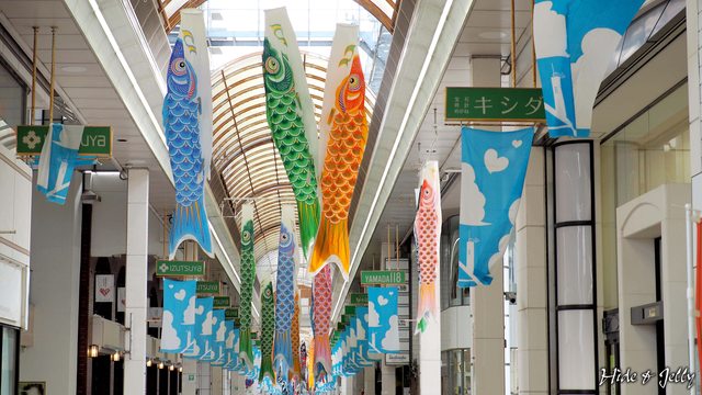 因為是五月,商店街內也掛起許多鯉魚旗,色彩繽紛的隨風飄逸,超有FU。