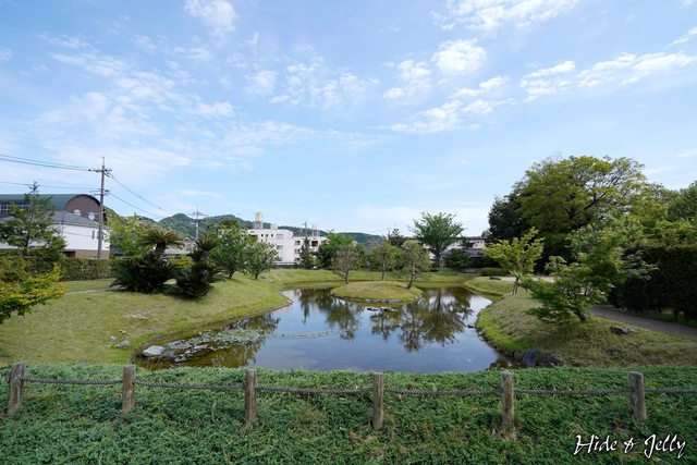由西北側朝往東南方向的池泉庭園樣貌,後面有座半圓型屋頂的建築蠻特別的,原來是山