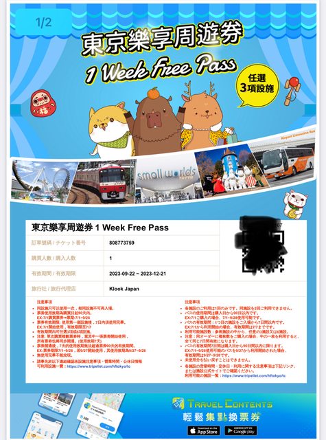 1. 讓售品項:東京樂享周遊券 1 week free pass*2/組