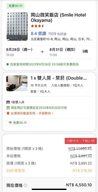 推 matsui07 : 岡山的微笑飯店看起來又新又好 在山口住過一次微笑 10/24 09:36