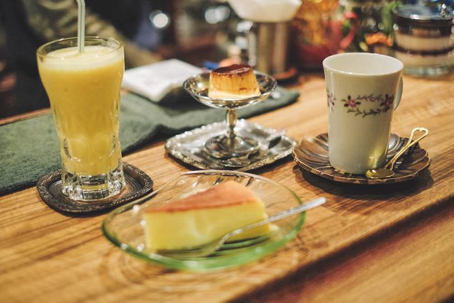 # 名物卡士達布丁、老派喫茶綜合果汁、咖啡歐蕾、自家製起司蛋糕