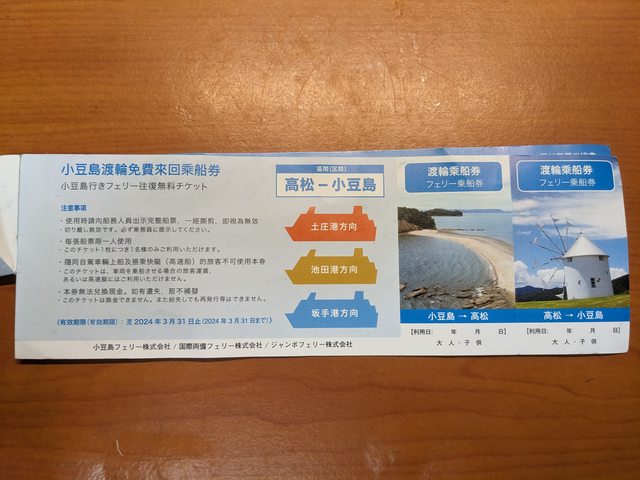 贈送內容:小豆島來回乘船券,上個月去四國,未安排小豆島故贈出