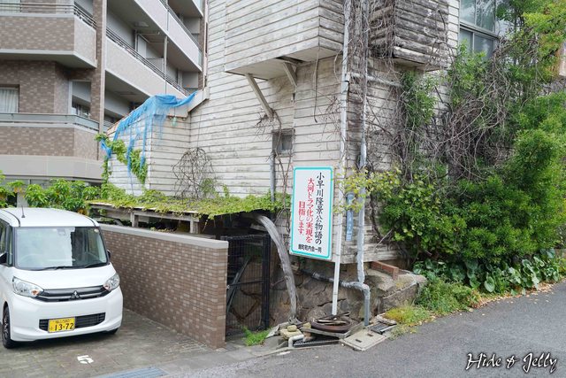 一整段石垣,卻被大樓的側門通道切斷了,原來這裡過去是三原城的「本丸中門」啊。