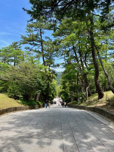 成排的松樹將參道分成三條平行線。由於正中間是神明的通道,請務必走在兩側水泥鋪面