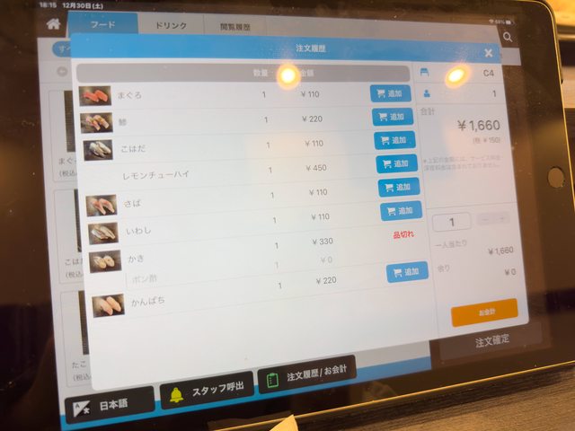 用平板點餐,點完師傅會送到面前。