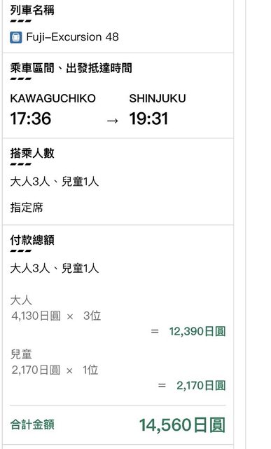 → wcc960 : 去程大人正確是(運費)2440+(特急料金)1620=4060才對01/07 01:22