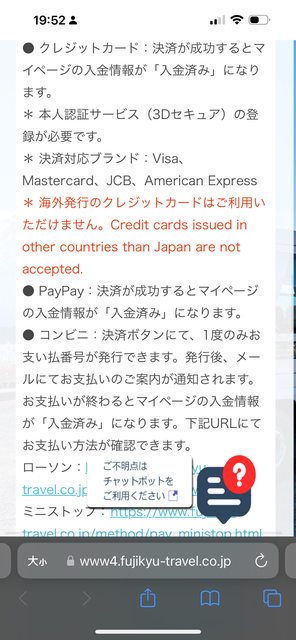 剛剛在富士急行官網預定二月初平日新宿到河口湖的巴士, 要刷信用卡付款時, 一直出現無法刷卡的訊息, 後來官網查, 不接受國外信用卡。 只接受國內信用卡, paypay,跟超商繳款。