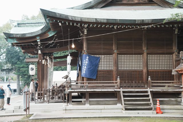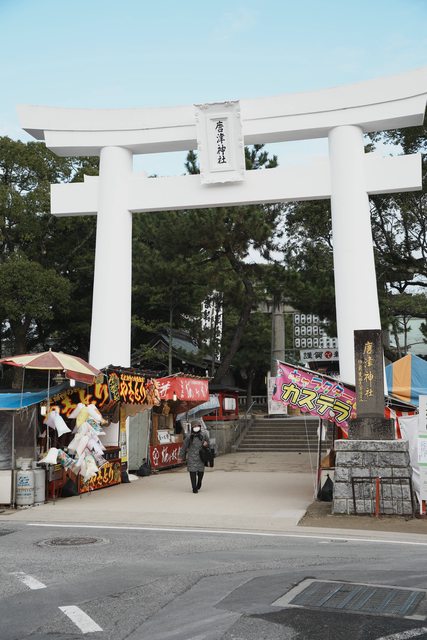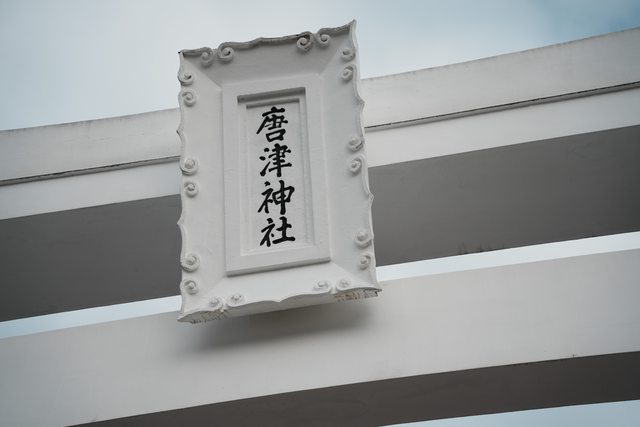 參觀完畢後,散步五分鐘來到唐津神社,巨大的白色鳥居非常吸睛