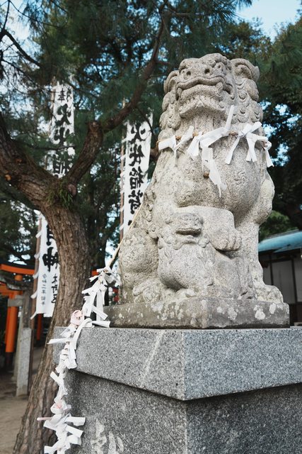 神社內的狛犬,脖子都掛滿了籤詩