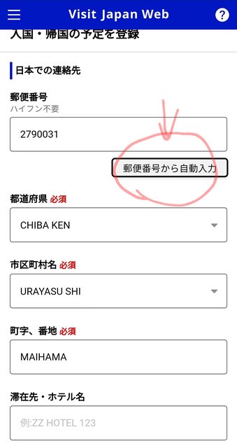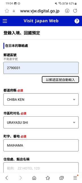 如果是中文介面,叫做「以郵遞區號自動輸入」(我特別切中文為了擷圖) 英文地址就會自動跳出來了。 你只要把最後幾丁目的數字(這邊是「1-8」)填在最後一個地址後面就好。 (旅館名稱應該不像英文地址那種需要特別去查的吧?) 這樣就完成了VJW的英文地址,完全不需要查日文翻成英文,只要打郵遞區號。 你還擔心手機沒電或是沒網路。 這些都可以在出國前先填好,沒理由在台灣發生沒電沒網路吧。 至於「入境時」手機沒有網路或是沒電, 沒網路可能常見,沒電應該不太會發生吧?飛日本三小時應該不至於沒電? 擔心沒網路的話,把 E化入境 的QR CODE擷圖就好。 擷圖的QR CODE是可以過入境審查跟稅關的。 (我還看過有人印出來QR CODE的。不過這樣浪費紙張我是覺得不太好) 以上,補充一點使用 E化入境 的小技巧。 -- ※ 發信站: 批踢踢實業坊(ptt-website.tw), 來自: 126.69.112.195 (日本) ※ 文章網址: https://ptt-website.tw/Japan_Travel/M.1705312975.A.537
