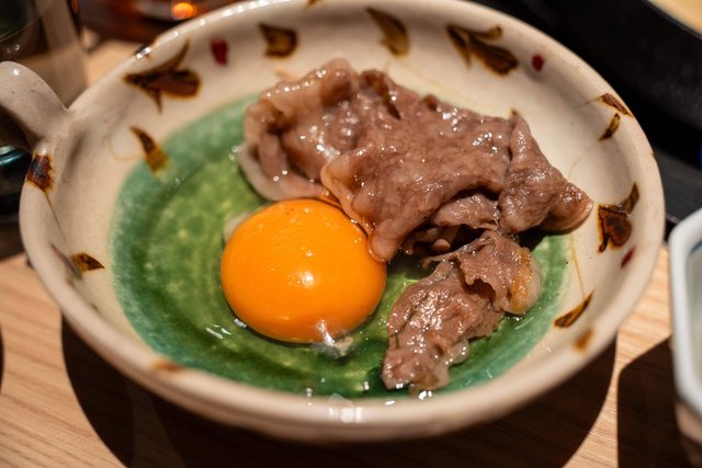 從壽喜燒醬汁撈起來的和牛配上蛋液,完美