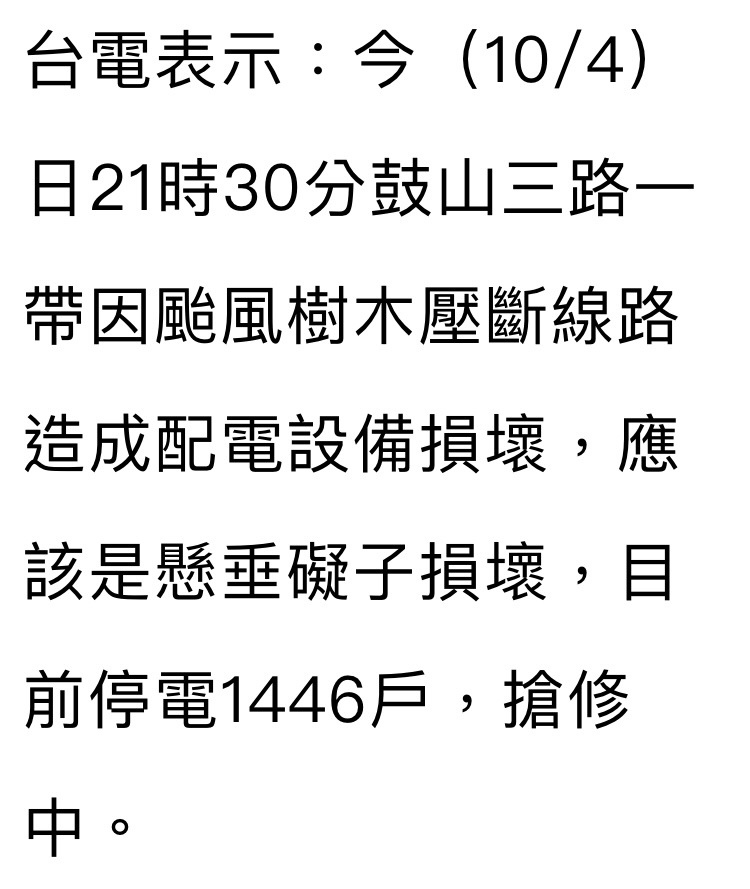 推 enjoyyou : 內惟鼓山路側也黑了 10/04 21:40