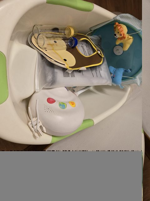 物品名稱:1.嬰兒澡盆、2.一般圍兜、3.費雪床鈴、4.嬰兒推車罩、5.標準玻璃奶瓶2個
