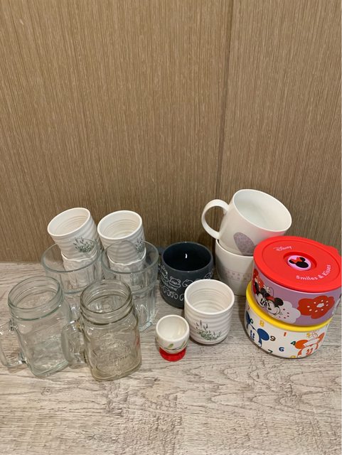 物品名稱:玻璃杯4個、日式茶杯5個、馬克杯3個,迪士尼碗(附蓋)2個、雞蛋杯1個(