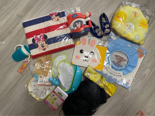 物品名稱:寶寶手冊 嬰兒枕頭 打地鼠玩具 奶嘴鍊 溜冰護膝(舊)洗髮浴帽..等,整圖