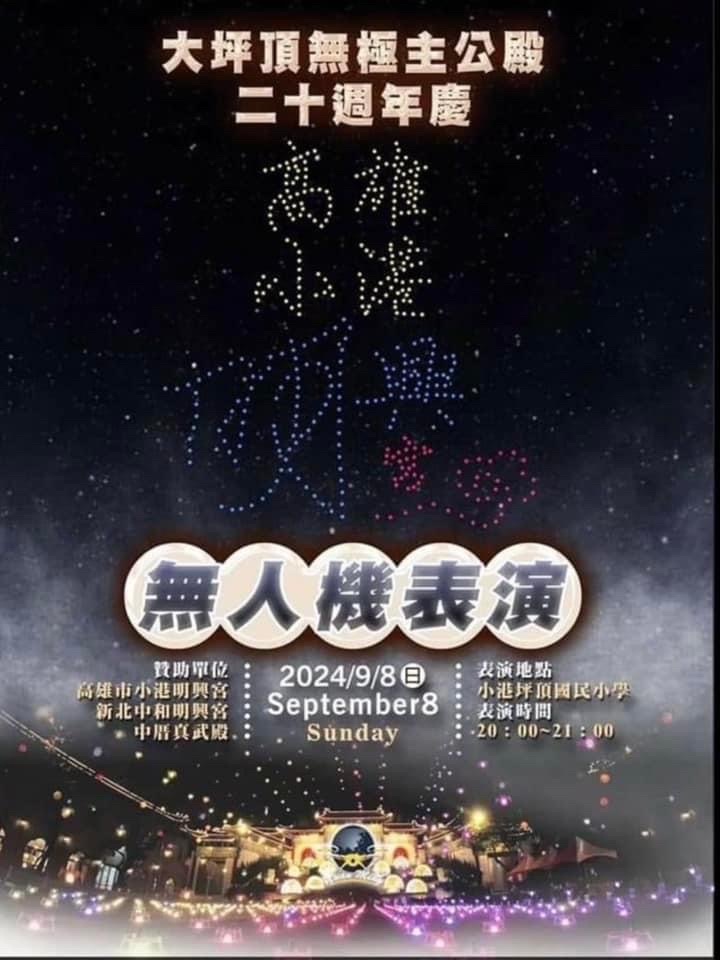 → ccdrv : 聽廟會人士說 晚上七點15分 電子煙火 八點無人機 09/08 11:18